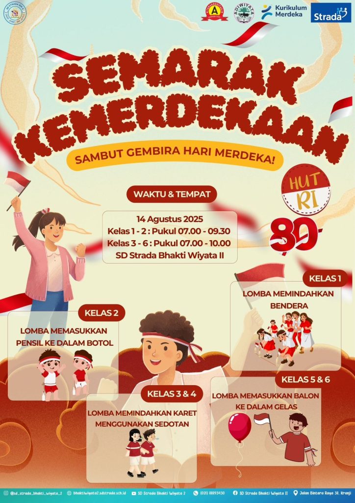 Peringatan HUT ke – 80 RI dirayakan dengan meriah di SD Strada Bhakti Wiyata II pada hari Kamis,14 Agustus 2025. Semarak Kemerdekaan SD Strada Bhakti Wiyata II mengadakan lomba :