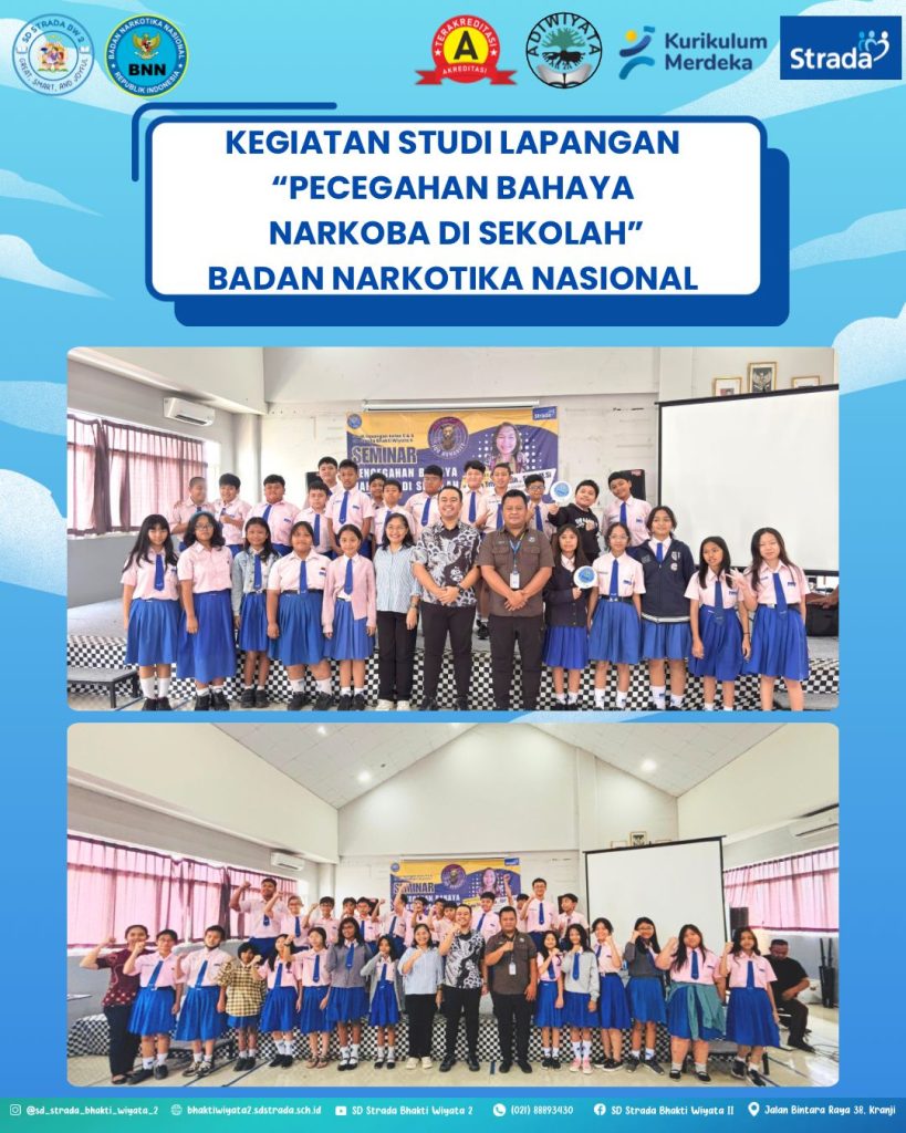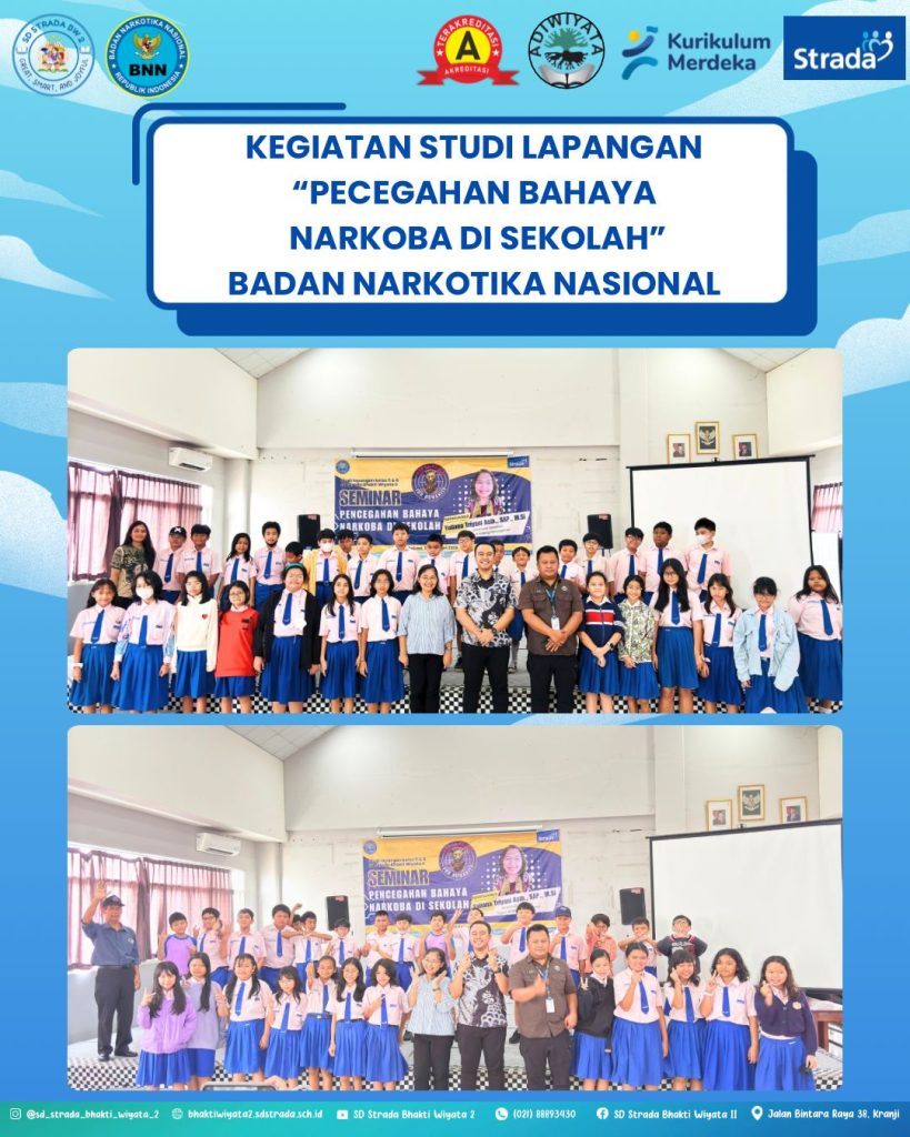 Kamis, 12 Februari 2026, Aula SMA Strada Bhakti Wiyata menjadi ruang pembelajaran yang penuh semangat bagi siswa kelas V dan VI SD Strada Bhakti Wiyata II. Mereka mengikuti kegiatan studi lapangan bertema “Pencegahan Bahaya Narkoba di Sekolah” bekerja sama dengan Badan Narkotika Nasional (BNN).